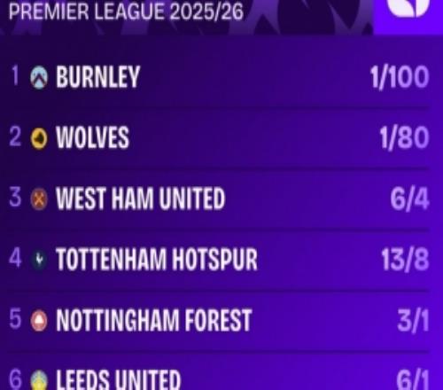 本赛季英超降级赔率排名:伯恩利居首,狼队次席,热刺第四