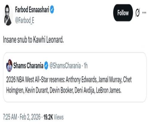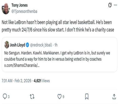 记者Josh Lloyd也对此表达不解:“申京、哈登、小卡、马尔卡宁悉数落选,而詹姆斯入选,我理解他入选的原因,肯定能找到他入选的理由,绝对不可是教练投票那么简单。”