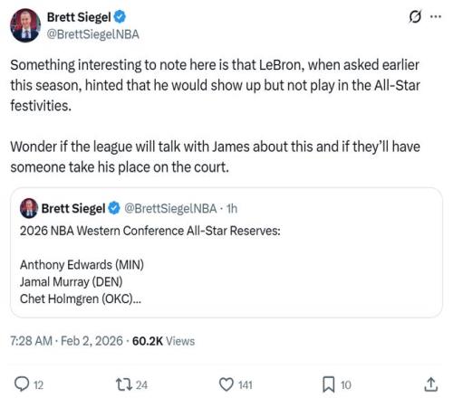 只不过,美媒ClutchPoints名记Brett Siegel跟进体现,詹姆斯虽然以替补身份入选,但不料味着他一定会出战。