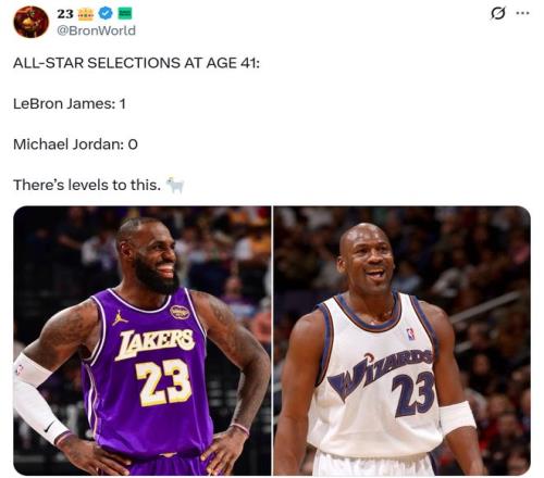 湖人自媒体BronWorld更是晒出41岁詹姆斯入选全明星,与乔丹41岁时已退役的比照数据,配文:“这其中亦有差别”体现詹姆斯比乔丹更强。