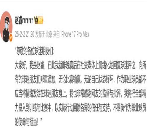 Õâ¸öʱºòÕÔî£Ò²ÊǵÚһʱ¼äÔÚÉç½»ÍøÕ¾ÉϸüÐÂÁ˶¯Ì¬£¬ËûÃ÷È·ÌåÏÖ£º×òÍíÈüºóÔÚÉ罻ýÌåÉÏÇéÐ÷»¯µØ»Ø¸´ÇòÃÔÆÀÂÛ£¬ÏòËùÓеÄÇòÃÔÅóÓÑÃÇÖ£ÖØÖÂǸ£¬ÎÞÂÛ½ÇÖðÊäÓ®£¬ÎÞÂÛ×Ô¼º×´Ì¬ÓÅÁÓ£¬×÷ΪְҵÇòÔ±¶¼²»Ó¦µ±½«ÇéÐ÷·¢Ð¹ÔÚÇòÃÔÅóÓÑÉíÉÏ¡£ÆäÊÃ÷ÈÕâÒѾ²»ÊÇÕÔÚÒ»´ÎÁË£¬Ö®Ç°¾Í·ºÆð¹ý¡£Ò²Ï£ÍûÕâ´ÎÊÂÇ飬ÕÔÉÒԺúÃ×ܽáºÍ·´Ë¼°É£¬È·ÊÃ÷ÈÕâÑùµÄÑÔÂÛÌ«°ÜÈËÆ·ÁË£¬Ò²Òý·¢ÁËÎÞÊýÈ˵IJ»Âú¡£