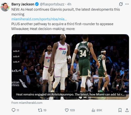迈阿密热火队记者巴里-杰克逊也透露,热火队跟雄鹿队就扬尼斯的交易一直在协商,他体现潜在的交易是热火送出泰勒-希罗、克莱尔-韦尔、特里-罗齐尔、2026年首轮交换权、2029年首轮交换权、2030年首轮签、2031年首轮交换权、2032年首轮签。(在威金斯的交易中如果还能获得一个首轮签,热火也愿意加上,甚至愿意添加更多年轻资产,换言之8换1还在加码)