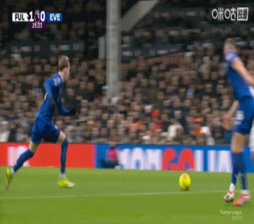 第75分钟,霍尔中路抢点,低射扳平比分,富勒姆1-1埃弗顿