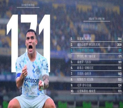 国米队长劳塔罗此役再度有进球入账,这是阿根廷前锋本赛季各项赛事第18球,意甲赛场上第14球,目前继续领跑射手榜 。更重要的是,这粒进球是劳塔罗国米生涯第171球,他正式追平传奇射手博宁塞尼亚,并列队史射手榜第三位,排在他身前的只剩梅阿查(284球)和阿尔托贝利(209球) 。