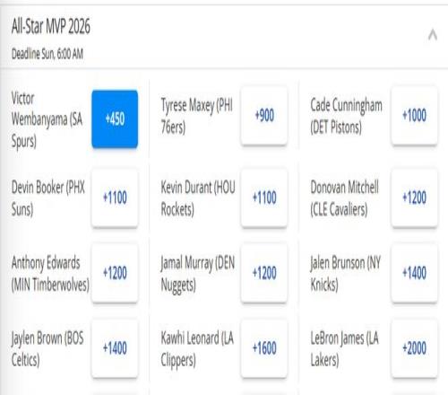 ±±¾©Ê±¼ä2ÔÂ12ÈÕ£¬2026ÄêÈ«Ã÷ÐÇÈü½øÈëµ¹¼ÆÊ±£¬±¾´ÎÈ«Ã÷ÐǽÓÄÉÃÀ¹ú¶ÓvsÊÀ½ç¶ÓµÄÐÂÈüÖÆ¡£Ë½«³ÉΪÕâ´ÎÈ«Ã÷ÐǵÄMVP£¿×îÐÂÅâÂÊÏÔʾ£¬ÎİàÑÇÂí¶Ï²ãÁìÅÜ£¬ÊÇ×î±»¿´ºÃµÄÇòÐÇ¡£¶ÅÀ¼ÌØÅÅÃûµÚ4£¬Õ²Ä·Ë¹Î»¾ÓµÚ12¡£