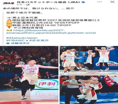 日本官方列出了世预赛对阵中国男篮和韩国队的角逐时间,并且写道:“在那个地方绝对不可输。”