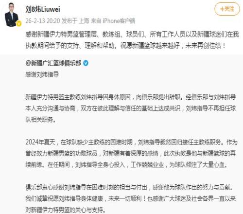 ±±¾©Ê±¼ä2ÔÂ13ÈÕ£¬ÔÚн®ÄÐÀº¹Ù·½Ðû²¼Í¨¸æ£¬Ðû²¼Áõì¿Ö¸µ¼ÒòΪÉíÌåÔÒòÇë´Ç£¬²»ÔÙµ£µ±Çò¶ÓÏà¹ØÖ°Îñ¡£Áõì¿Í¨¹ýÉçý·¢Éù»ØÓ¦£¬Ð»Ð»Ð½®ÒÁÁ¦ÌØÄÐÀºÖÎÀí²ã¡¢½ÌÁ·×é¡¢ÇòÔ±ÃÇ¡¢ËùÓÐÊÂÇéÈËÔ±ÒÔ¼°Ð½®ÇòÃÔ¡£