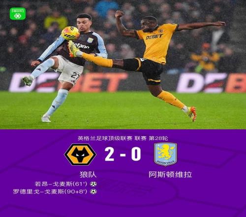 北京时间2月28日英格兰足球顶级联赛 联赛 第28轮,狼队主场对阵阿斯顿维拉。上半场,两队均无建树。下半场,若昂-戈麦斯突破僵局。读秒阶段,罗德里戈-戈麦斯破门锁定胜局。全场角逐结束,维拉0-2不敌狼队,遭遇各项赛事三场不堪。