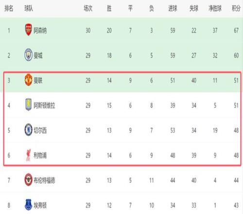 由于曼联输球,英超争四花样也越发杂乱了。截至目前,曼联、维拉、切尔西和利物浦这4支争四球队,本轮的角逐都已经结束,由于切尔西在客场4-1大胜维拉,因此他们已经反超利物浦,排名回到第五位,而曼联虽然继续排名第三,可是他们只领先第六的利物浦3分,争四形势随时将爆发逆转。