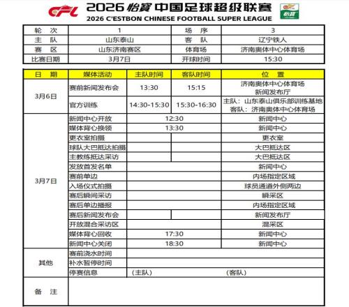 闪电体育3月5报道 3月7日晚,2026赛季中超联赛将正式拉开战幕。山东泰山队首轮将坐镇主场济南奥体中心,迎战升班马辽宁铁人队。今天下午,双方赛前宣布会及训练安排已正式宣布。