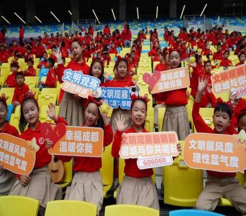 揭幕战现场,中共成都会委宣传部、市文明办联合市少工委邀请红领巾足球学校、四川天府新区第八中学、成都师范隶属小学、成都会第十八中学校等12所中小学的近600位同学们齐聚公益看台。