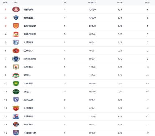 在积分榜上,成都蓉城排名第1,拿到3分。同样拿到3分的云南玉昆排名第2。重庆铜梁龙拿到1分,排名第3。青岛西海岸、大连英博、辽宁铁人和深圳新鹏城都是0分,排名第4到第7。山东泰山负3分,排名第8。