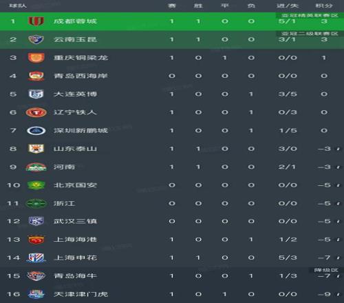 北京时间3月8日,昨天的中超第一轮进行了5场角逐,算上前天成都蓉城5-1大胜深圳新鹏城,目前结束了6场对决,我们看看最新积分榜变换!
