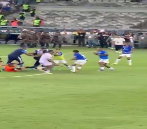 在冲突中,克鲁塞罗前锋若热先是跳起飞踢敌手,跟上作势踢了一脚。随后边跑边拳打米内罗竞技替补门将德尔芬姆。