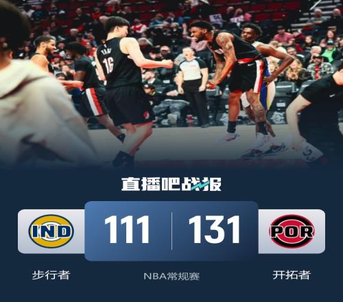 此役一上来开拓者率先发力早早占优,西亚卡姆连造杀伤率队止血,末段双方你来我往比分紧咬,首节结束时两队战成30平,次节回来,双方延续势头继续僵持,但中段步行者进攻突然断电,亨德森单节13分率队轰出20-2进攻热潮,半场战罢,开拓者确立17分优势。易边再战后步行者召回进攻感受,但开拓者多点开花牢牢占优,三节结束后开拓者坚持20分领先,末节上来,杨瀚森替补登场造犯规两罚全中,随后接韦斯利妙传暴扣打成2+1,最终开拓者131-111大胜送步行者9连败。