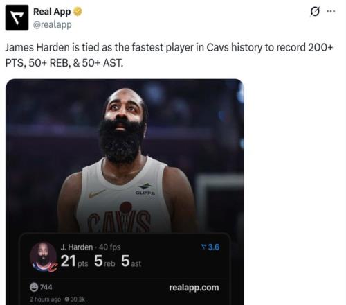 骑士队之所以轻松拿下大胜,哈登是最大元勋,一战又创立多项纪录的同时,更是迎来里程碑迈入传奇球星行列。