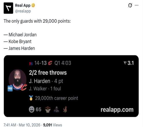 凭借这样的体现,哈登生涯总得分正式突破29000分大关,成为NBA历史上第九位做到这一点的球员,也成为NBA历史上唯一一位生涯至少拿到29000分,同时至少命中3000记三分的球员。