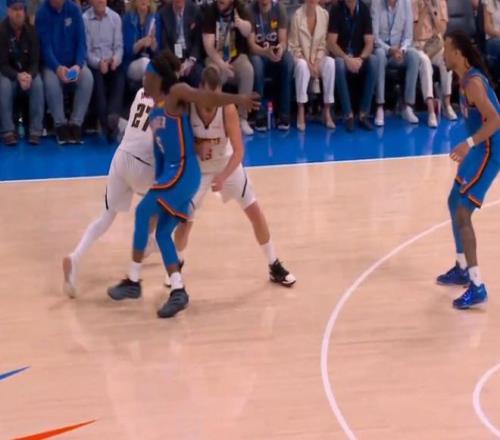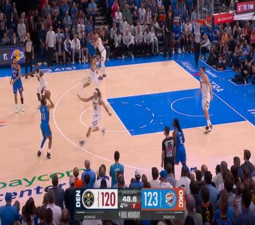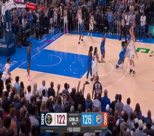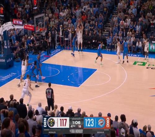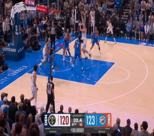 ——剩下9秒前,杰林威廉姆斯出错,约基奇与穆雷防拆,接球投进三分的同时,杰林推倒了穆雷,按规则,穆雷加罚命中,一个回合,掘金拿了4分,追平角逐