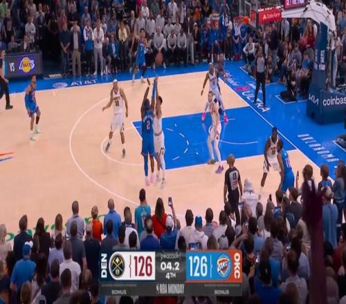 ——雷霆最后一攻,亚历山大接球单挑琼斯,投进绝杀三分,没有暂停的掘金后场孤注一掷的三分不进,雷霆拿下胜利