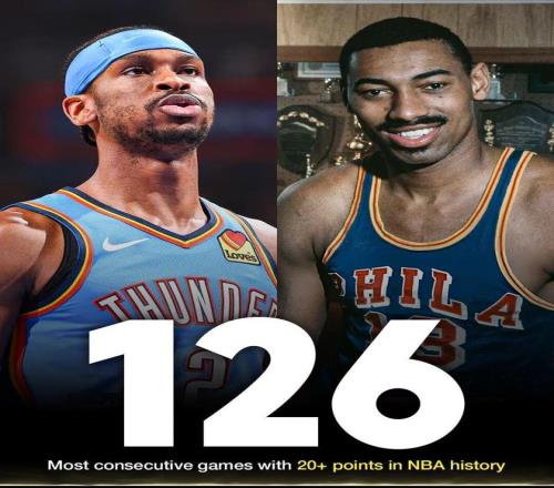 第三节,亚历山大打满12分钟,单节获得8分5助攻,三节结束时,亚历山大已经获得25分7篮板12助攻,连续20+场次追平张伯伦。