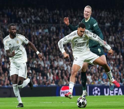 第68分钟萨维尼奥右路下底传中,吕迪格抢在后点困绕的哈兰德之前,将皮球解围力保球门不失,7分钟之后,皇马小将皮塔奇禁区内出错,给了奥赖利直接起脚的时机,幸亏库尔图瓦神扑救主力保球门不失,让皇马在主场乐成零封了蓝月军团。