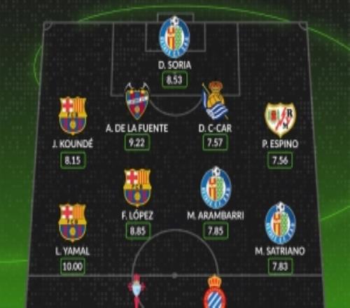 WhoScored西甲第26轮最佳阵:亚马尔、费尔明、孔德在列